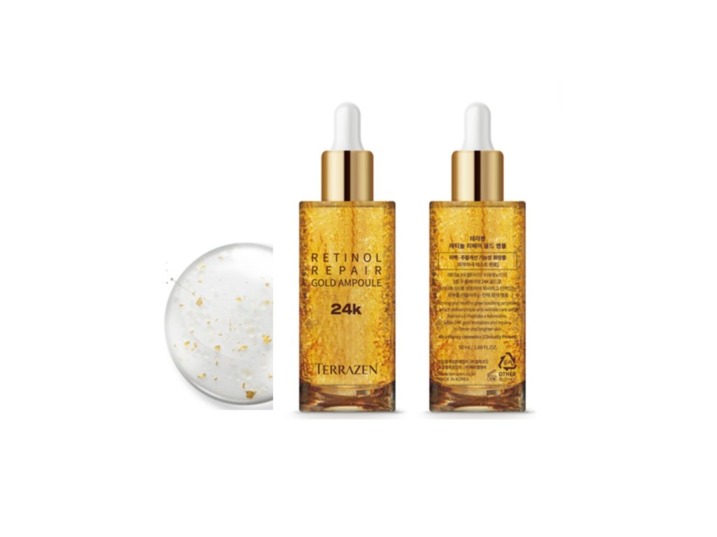 Terrazen Retinol Repair Gold Ampoule 50 ml – luxusní anti-aging ampule/sérum s 24 karátovým zlatem a retinolem navržené pro intenzivní omlazení pleti. Obsahuje pravé 24 k zlato, retinol, retinal, bakuchiol a 6 druhů peptidů, které společně redukují jemné linky a vrásky, zpevňují pokožku a dodávají jí zdravý, zářivý vzhled. Ampule zároveň obsahuje kyselinu hyaluronovou, adenosin a ceramidy pro hydrataci a podporu kožní bariéry, a má jemnou, rychle se vstřebávající texturu.