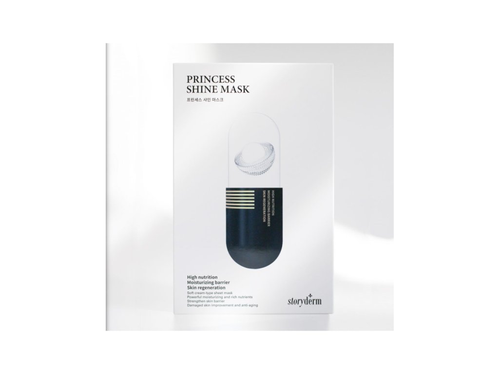 StoryDerm Princess Shine Mask je jednorázová pleťová maska v plátýnku, navržená pro výživu, hydrataci a regeneraci unavené či suché pleti. Obsahuje ženšen, extrakty a hydratační látky jako kyselina hyaluronová a hydrolyzovaný kolagen, které pomáhají zlepšit pružnost pokožky, redukovat jemné vrásky, posilovat kožní bariéru a dodat pleti zdravý, svěží vzhled. Masku se používá na očištěnou pleť po dobu cca 15–20 minut; po sejmutí se zbytek sérum vmasíruje do pokožky.